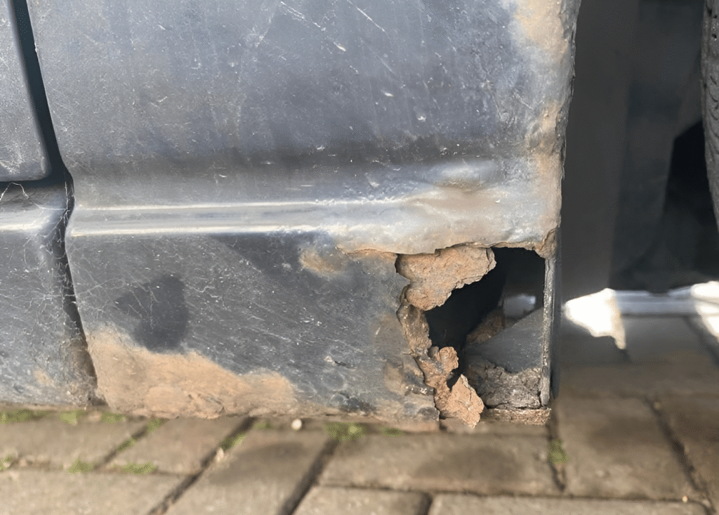 A major contributor to this issue is the design of the arch liners. Unlike plastic liners found on many modern vehicles, the Mk1 uses carpet-like fabric liners in the rear arches. These absorb and retain large amounts of water, especially in wet or salty conditions. They can stay damp for long periods — creating a perfect environment for corrosion to quietly eat away at the metal beneath the surface, out of sight. This corrosion may even reach the rear strut towers, particularly on hatchback and saloon models. Once it spreads this far, repairs become more complex and invasive.